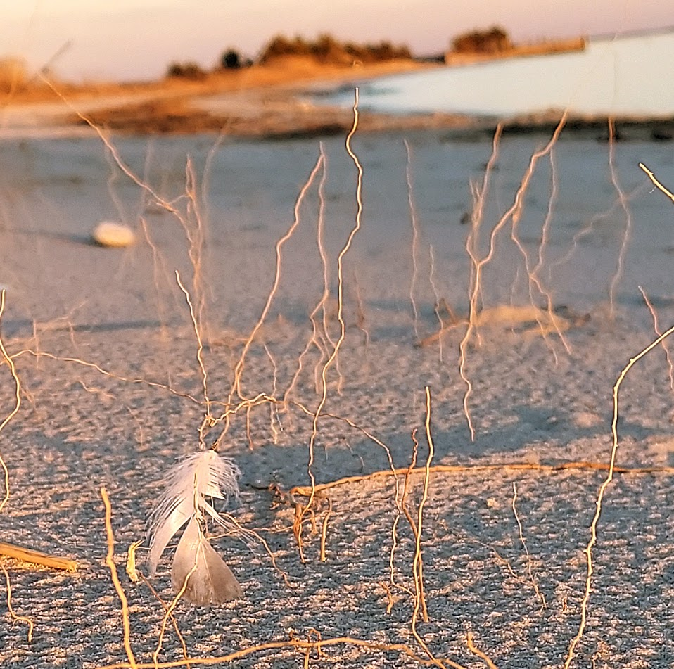 Yesterday I woke up with the words “hope is the thing with feathers” on my mind, the first line of the poem “Hope.” by Emily Dickinson. Later, while walking on the beach, I found a white feather fluttering on a weedy stem, which seemed quite auspicious considering my thoughts and it being the first day of the new year.