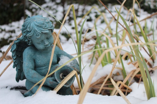 This little angel serenely watches over the fish wintering in the bottom of my little garden pond.